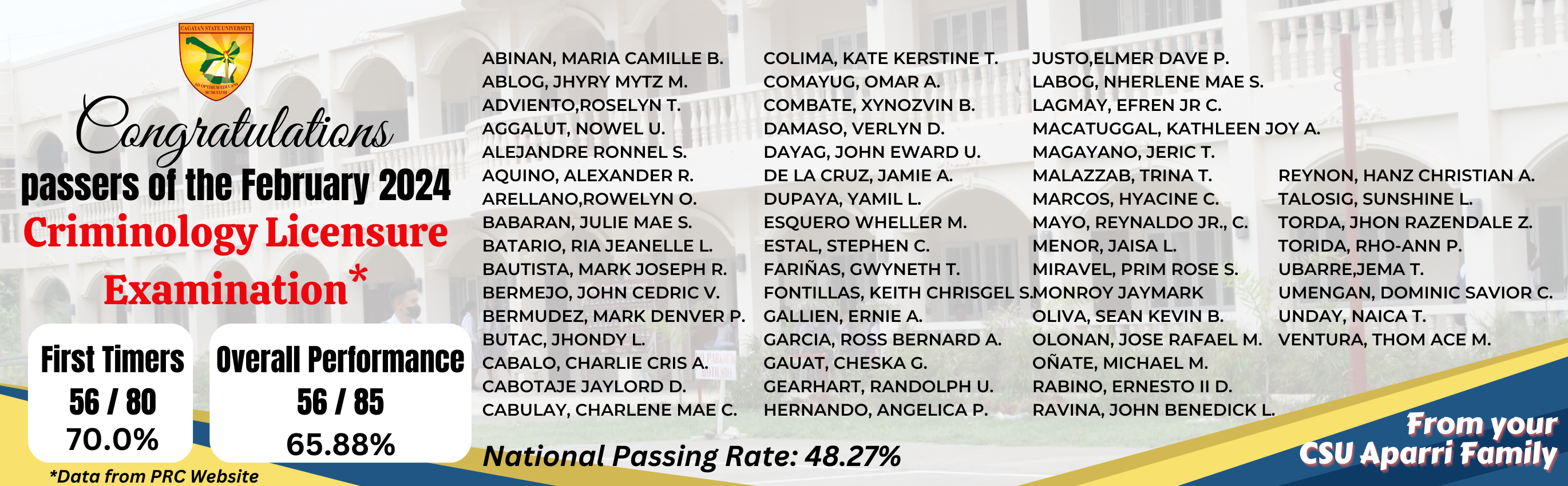 Fifty-six (56) BS Criminology graduates of the College of Criminal Justice Education, CSU Aparri successfully passed the Criminology Licensure Examination held on February 2-4, 2024. Based on the official report released online by the Professional Re...