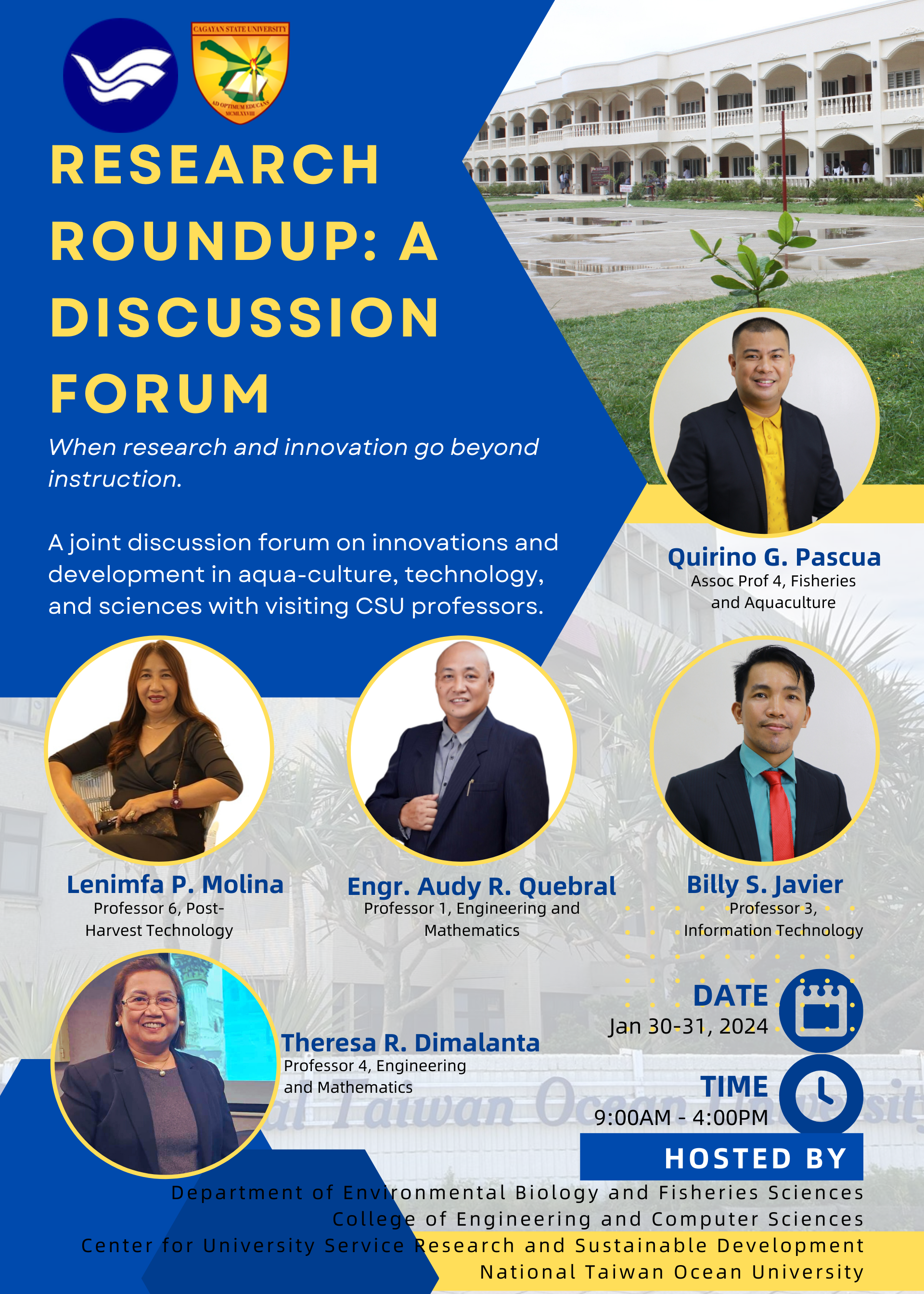 Five (5) Professors from the Cagayan State University participated in the research roundup: a discussion forum hosted by the National Taiwan Ocean University on January 30-31, 2024 at Keelung City, Taiwan. The forum highlights an academic and researc...