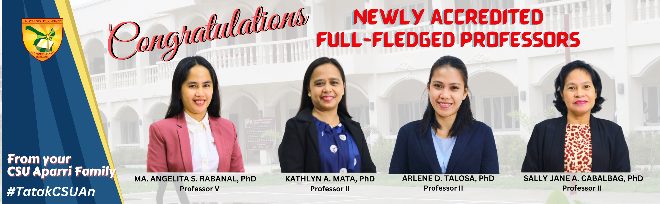 Boosting the faculty profile of the campus, four (4) faculty members of the Cagayan State University at Aparri successfully hurdled the Phase 2 Accreditation Process conducted by the Commission on Higher Education and were recommended the esteemed ti...
